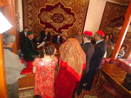 После этого новобрачный со своей свитой садится в другом конце дома, к нему выводят невесту, зажигают священную траву страхм – это для Памира то же, что для других регионов Таджикистана хазориспанд, — и начинается церемония никоха. Невеста и жених стоят перед халифой, он читает суры из Корана, а затем вручает молодоженам документ, по типу брачного договора, в котором жених и невеста официально обязуются любить и беречь друг друга. Кстати, этот документ имеет и определенную силу: у исмаилитов есть специальный религиозный институт, который при необходимости решает вопросы супругов на основании этого документа.
