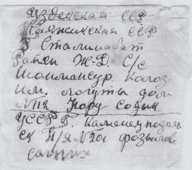 Ба падари мехрубонам, очем ва Норҷон аз тарафи Юсуфчон. Ман дар шахри Украина сихат ва саломат хизмат карда гаштаам ва аз саломатии шумоен умедворам. 24.06.41 сол як хати саломати навишта будам, умедаст ки расида бошад. Баода шумоен маълум шудааст ки бо немисон чанг сар шудааст , лекин моен ба чанг холо нарафтем , хотирҷам бошед.
