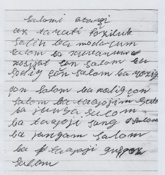 Саломи оташин аз тарафи Фозили Солих ба модарам салом, ба хохарам Хосиятчон салом, ба Содиқчон салом ва Розиқҷон салом, ба Холиқҷон салом, ба тағохоям салом, ба янгам салом, ба тагои Санг салом ва янгам салом, ба тағои Кучкор салом