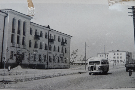 1954 год. На снимке: поселок Северный на центральной ул.Ленина. И здесь видно, что проезжая часть дороги была выложена булыжной мостовой.