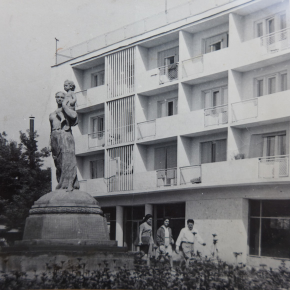 Душанбе, 1964 год. Вид на новое здание, в котором когда то размещался детский магазин «Сказка» построенное на проспекте В. Ленина. На переднем плане — скульптура матери с ребенком. Памятник не сохранился.