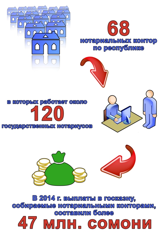 По словам Каримовой, в Таджикистане осуществляют деятельность только государственные нотариусы. В стране существует 68 нотариальных контор, в которых работает около 120 нотариусов. Ежегодно растут уплаты в госказну, собираемые нотариальными конторами. В 2014 году они составили более 47 млн. сомони.