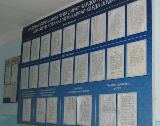 Однако в этом есть некоторые нюансы. В здании суда района Фирдавси города Душанбе, в левом крыле которого расположена нотариальная контора, стенд с вышеназванными документами расположен в полутемном коридоре, достаточно высоко, и прочесть вывешенную на нем информацию сложно. Воспользоваться ею было бы возможно лишь при наличии фонаря и стула. Между тем, чтобы понять, сколько стоит та или иная услуга, необходимо очень внимательно прочесть текст, и произвести вычисления, поскольку расценки приведены в процентном соотношении от показателя для расчетов (ПДР) – в настоящее время этот показатель составляет 40 сомони.