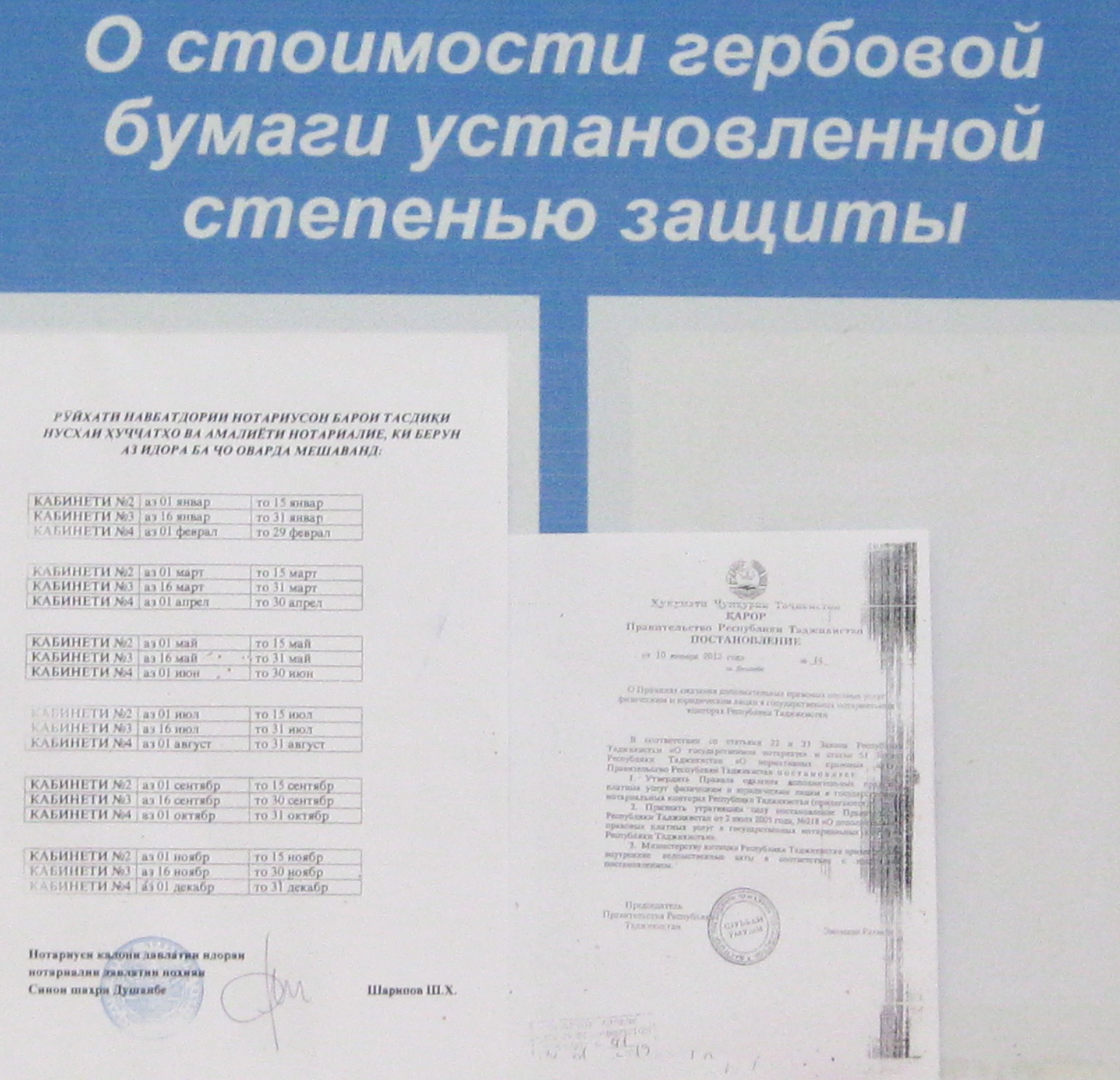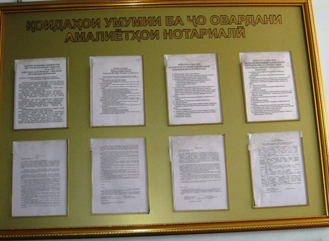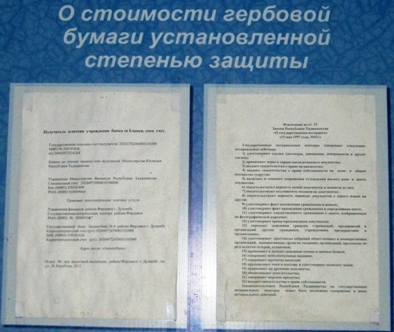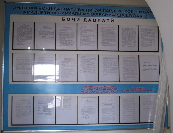 Небольшой стенд со стандартным набором информации устроен без дополнительного освещения, а второй расположен у лестницы, в слабо освещенном месте. Здесь нотариус запросил за заверение 2 сомони 40 дирам.