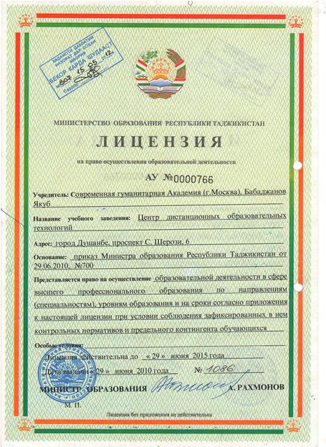 В итоге в 2012 году приказом Министра образования и науки была аннулирована лицензия о праве ведения образовательной деятельности, выданная Министерством образования Республики Таджикистан Центру дистанционных образовательных технологий Современной гуманитарной академии города Москвы в городе Душанбе от 29.06.2010.