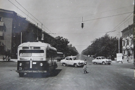 1960 год. Троллейбус маршрута №2 на перекрестке улиц Дониш и Айни