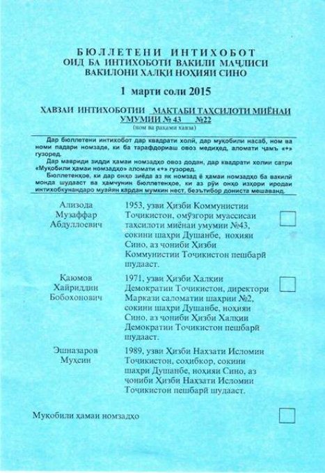 На избирательном участке №22 района Сино напротив имени кандидата в депутаты районного маджлиса от Партии исламского возрождения Таджикистана Мухсин Эшназарова отсутствовало место для отметки. Также в бюллетене отсутствует отчество кандидата.
