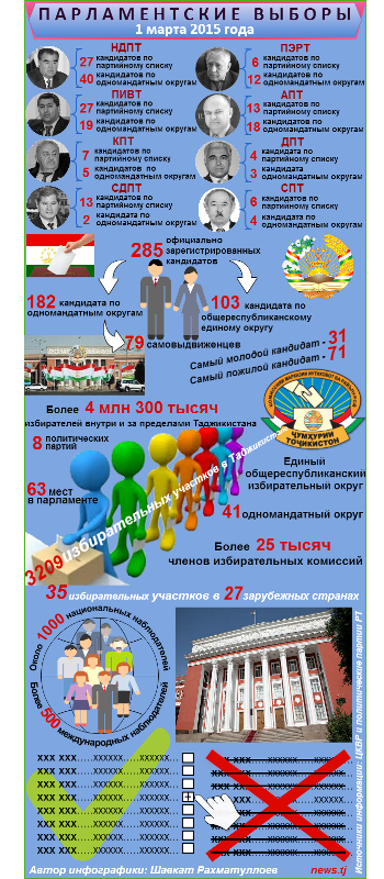 На 63 депутатских места претендуют 285 кандидатов, в том числе 182 кандидата по одномандатным округам и 103 кандидата по единому общереспубликанскому округу. Депутаты парламента Таджикистана избираются сроком на пять лет. На выборы идут все восемь официально зарегистрированных партий страны – Народная демократическая, Партия исламского возрождения, Социал-демократическая, Социалистическая, Партия экономических реформ, Аграрная, Коммунистическая и Демократическая. Самое большее число кандидатов – у правящей Народной демократической партии, меньшее – у Демократической. Самому молодому кандидату — 31 год, а самому зрелому – 71 год.