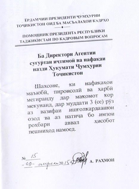 Данная ситуация возникла в связи с изданием Распоряжения № 15 от 9 апреля 2015 года помощником президента Республики Таджикистан по кадровым вопросам Асадулло Рахмоном, направленного Директору Государственного Агентства социального страхования и пенсий при Правительстве РТ, в котором говорится об увольнении пенсионеров, военных и инвалидов, получающих пенсии, с места их работы, в течение трех дней. Судя по смыслу распоряжения, предположительно, имеется в виду увольнение из государственных органов. Возможно, подобные распоряжения направлены и в другие государственные органы страны.