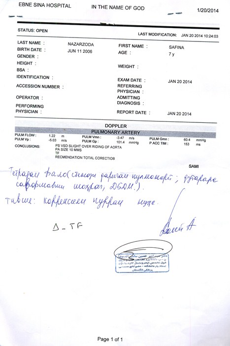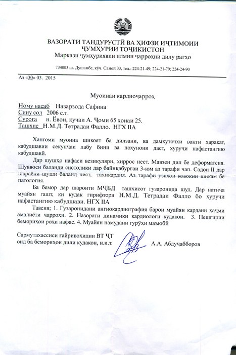 У 9-летней Сафины Табаровой порок сердца, врачи настаивают на срочной операции, иначе девочка просто не выживет. Ее отец Музафар Табаров обратился с письмом ко всем читателям «АП». На операцию, которую готовы сделать таджикские врачи, требуется 4,5 тыс. долларов. Но ответ точный будет только 1 июня. Если таджикские врачи все-таки не рискнут делать операцию здесь, девочку придется отправлять в Россию или Индию, но для этого потребуется средств больше.