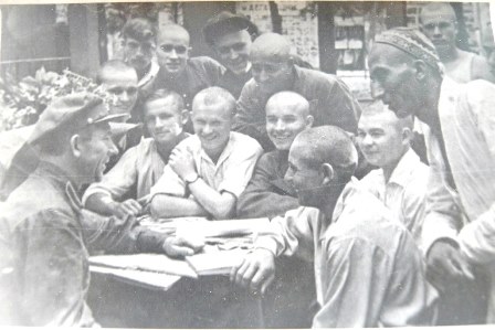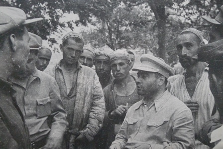 Фото 5. Апрель, 1939 год. На снимке: рабочие строительной артели г. Сталинабад беседуют с первым секретарем Компартии Таджикистана Дмитрием Протопоповым.