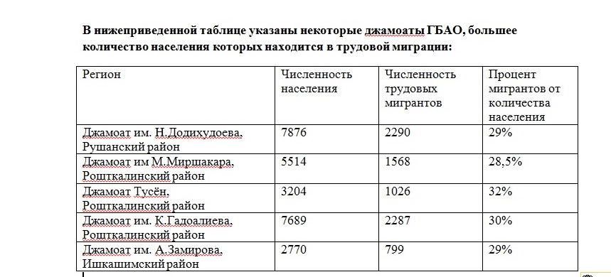 По официальным данным, сегодня за пределами ГБАО, в основном в России, находятся свыше 34 тысяч трудовых мигрантов из Горного Бадахшана. По мнению местных экспертов, на самом деле их количество намного больше. Трудовые мигранты из ГБАО составляют свыше 15 процентов от общего и более 25 процентов от трудоспособного населения региона. Следует отметить, что мигранты составляют 20 процентов от общего количества сельского населения ГБАО.