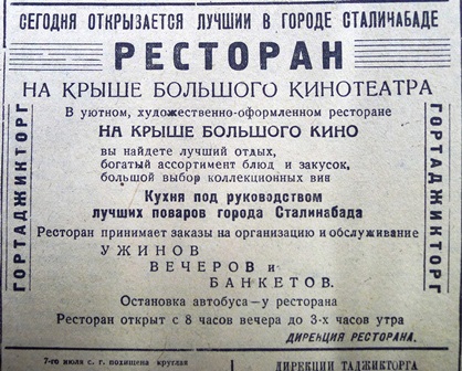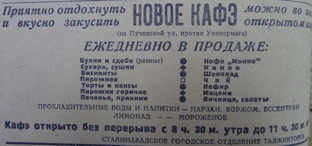 1940 год.  Реклама нового кафе в г. Сталинабад.