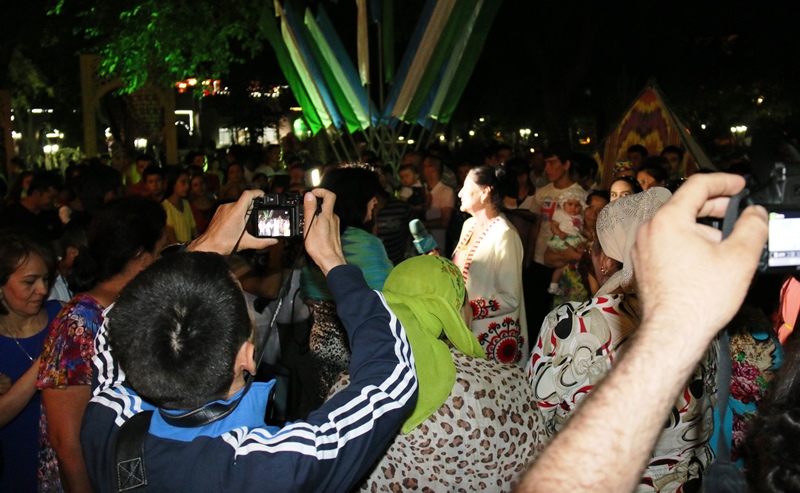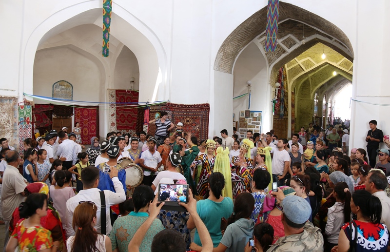 Затем фольклорно-этнографические коллективы из разных регионов Узбекистана и гости фестиваля начали шествие у подножия цитадели Арк, прошли по площади мемориального комплекса Манораи Калон и, миновав торговые купола «Токи Заргарон», завершили красочное шествие у архитектурного комплекса «Лаби хавз», где и состоялось торжественное открытие фестиваля.