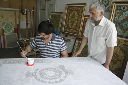 Заходим в мастерскую, где орнаментальной росписью «кундаль» заняты Махмадкарим Каримзода и его ученики. Работа с росписью «кундаль» издавна считалась признаком роскоши, почиталась дорогим подарком и потому не теряет своей ценности и в наши дни.