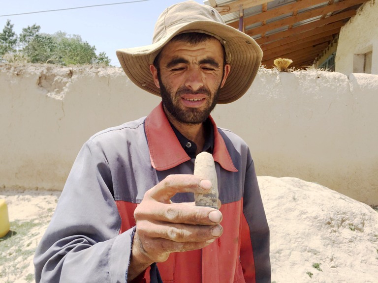 Житель Дараи об Зайдулло Наимов со снарядом от пушки БМП, попавшим в его дом.