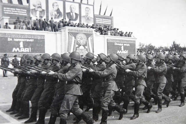 Сталинабад (Душанбе), Красная площадь. Воины 201-ой горно – стрелковой дивизии на параде 1 мая 1953 года. На трибуне — руководители Таджикской ССР, парад принимает командир дивизии, генерал-майор Апакидзе Валентин Андреевич.