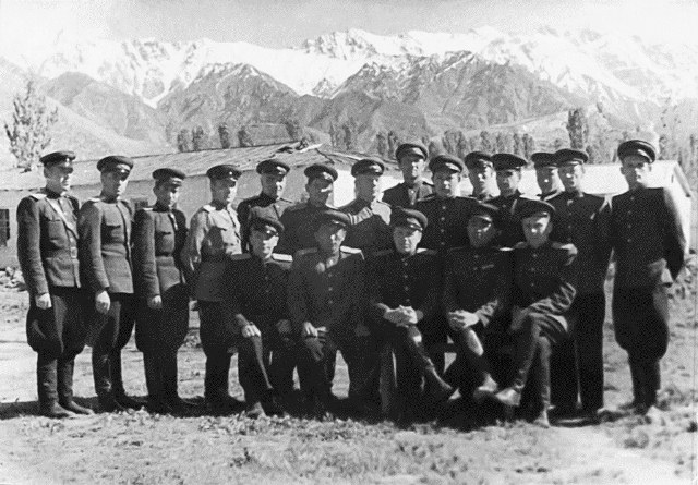 На снимке — военнослужащие 201-ой стрелковой дивизии, принимавшие активное участие в спасательных работах у селения Хаит. В центре сидит командир дивизии, генерал — майор Михаил Кучерявенко, слева от него — военком Таджикской ССР, первый офицер таджик, воспитанник легендарного комдива Федина, участник Великой Отечественной войны, полковник Рафи Аманов.