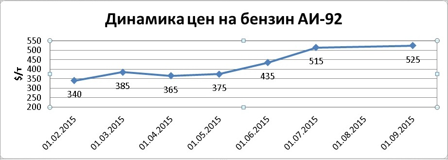 В профильных ведомствах Таджикистана объясняют, что российские НПЗ в августе повысили оптовые цены на $130 за тонну и отпускные цены с завода теперь составляют $515 за тонну. Рост отпускных цен на бензин с российских НПЗ приведен в графике.