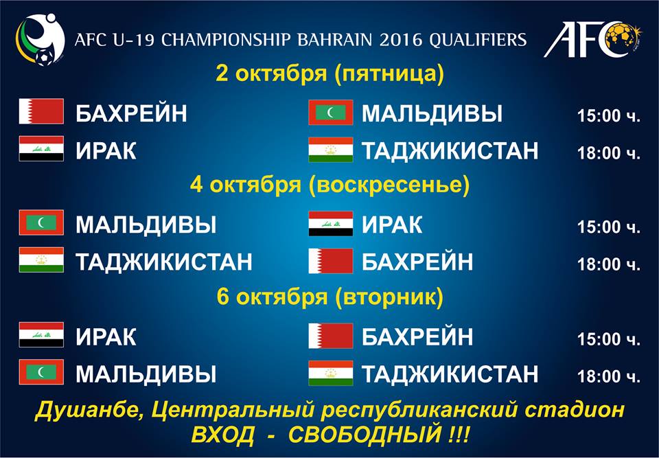 Отборочный турнир в этом квартете стартует в пятницу, 2 октября. В 15:00 часов на поле Центрального стадиона столицы выйдут команды Бахрейна и Мальдив, а в 18:00 часов начнется матч между сборными Таджикистана и Ирака.