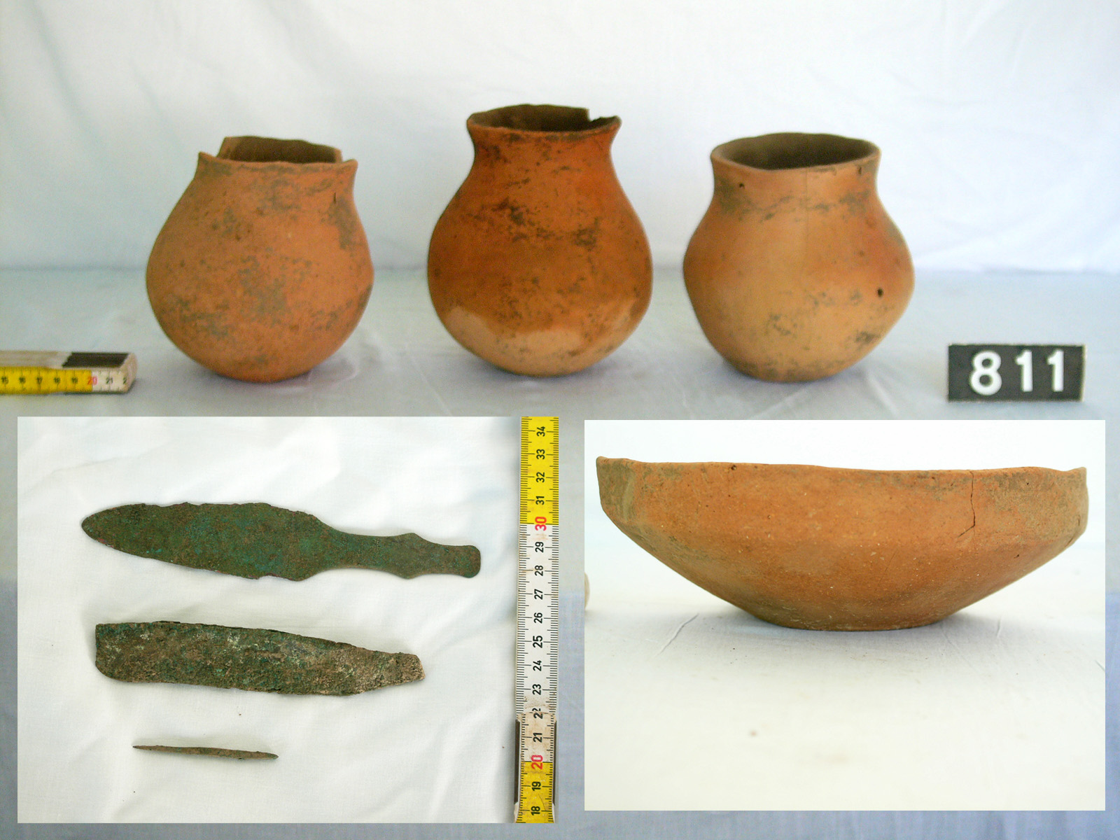 Найдены фрагменты сосудов, изготовленных на гончарном круге, к которым относятся в основном тарные сосуды и горшки.  Из черепков, собранных в северо-восточной части ямы, впоследствии почти полностью реконструирован горшок с округлым дном. К особым экземплярам можно отнести горшок, который украшен бороздками и небольшими круглыми насечками, крышки и многочисленные чаши, некоторые из которых раскрашены краской. Роспись имеет красный цвет, сделана в виде треугольников, зигзагообразных линий и лент.