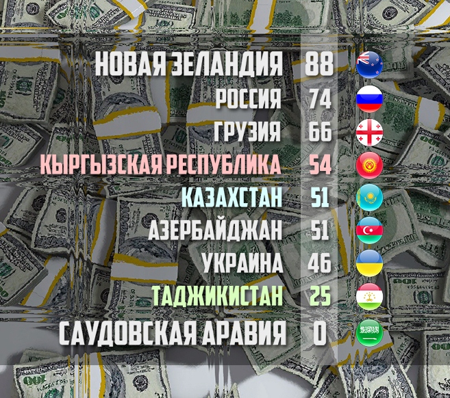 Казахстан (51 балл) находится в чуть менее привлекательной позиции, отставая от Кыргызстана по открытости бюджета на несколько пунктов. Таджикистан находится в красной зоне с 25 баллами, которые говорят о том, что эта страна практически не предоставляет никакой информации своим гражданам о бюджете.