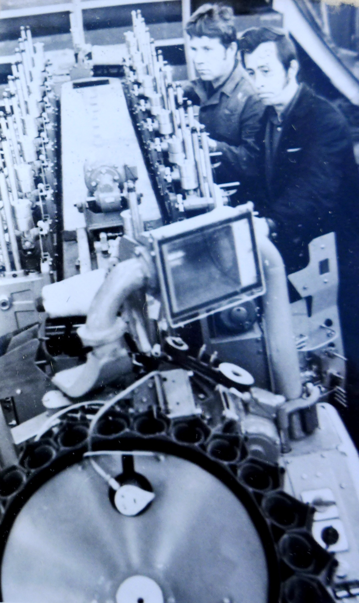 На фото — сборка и наладка мотально-карусельного автомата, производимого на душанбинском заводе «Таджиктекстильмаш» по лицензии бельгийской компании «Жильбос». На заводе ТТМ работало 2500 специалистов (инженеров, техников, рабочих), это был крупный завод не только по меркам Таджикистана, но и по меркам Советского Союза. Производство было уникальным в области текстильного машиностроения, т.к. полностью обеспечивало СССР и многие иностранные государства мотальным оборудованием, ткацкими станками, прядильными машинами ПСК, на которых по запатентованной технологии (патент СССР) получали шерстяную и полушерстяную пряжу с большой скоростью прядения. Такое производство в то время имели всего 3 страны в мире.