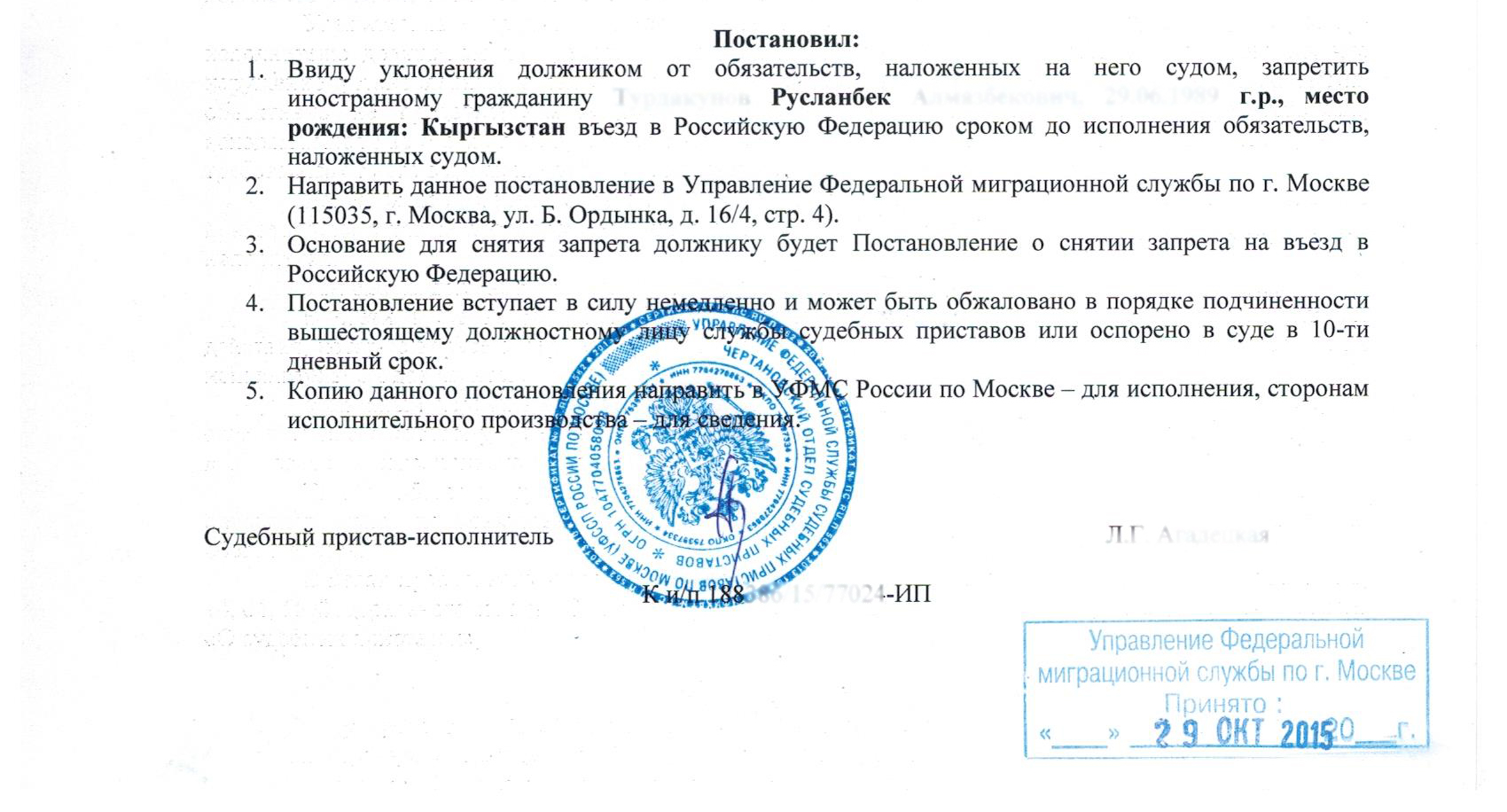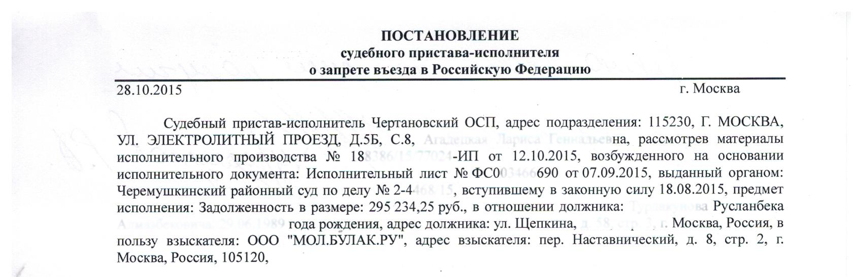 показал документы, на основании которых ему был закрыт въезд в РФ. С его согласия мы отсканировали и решили опубликовать основную часть документа. Данная «бумага» послужит доказательством, что компания «Мол Булак» не «пустословит» и всё-таки есть реальные основания для закрытия въезда в РФ своим должникам