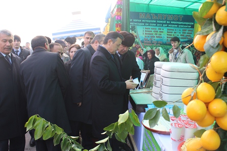 До начала торжественного собрания на площади имени Рудаки в Курган-тюбе была организована выставка достижений сельского хозяйства районов области.