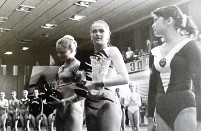 В 1976 году в Душанбинском дворце спорта прошли всесоюзные соревнования на Кубок СССР по художественной гимнастике. На снимке в центре — обладательница Хрустального кубка СССР, единственная советская гимнастка, которая дважды была абсолютной чемпионкой мира (в 1977 и 1979 гг.) Ирина Дерюгина, справа чемпионка Европы Галима Шугурова, слева таджикская спортсменка, чемпионка мира по художественной гимнастике душанбинка Эрика Шиллер.