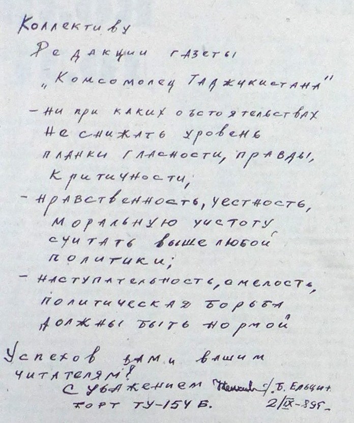 Почти неделю провел в Таджикистане председатель Комитета по делам строительства и архитектуры Борис Ельцин. 2 сентября 1989 года он встретился с журналистами газеты «Комсомолец Таджикистана» и оставил такое интересное пожелание коллективу редакции.