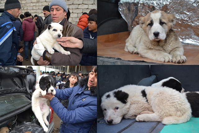 Торговля на птичьем рынке кипит уже у самого входа, здесь продают щенков среднеазиатской овчарки, или, как их еще называют, алабаев. Есть на продажу и щенки других пород.