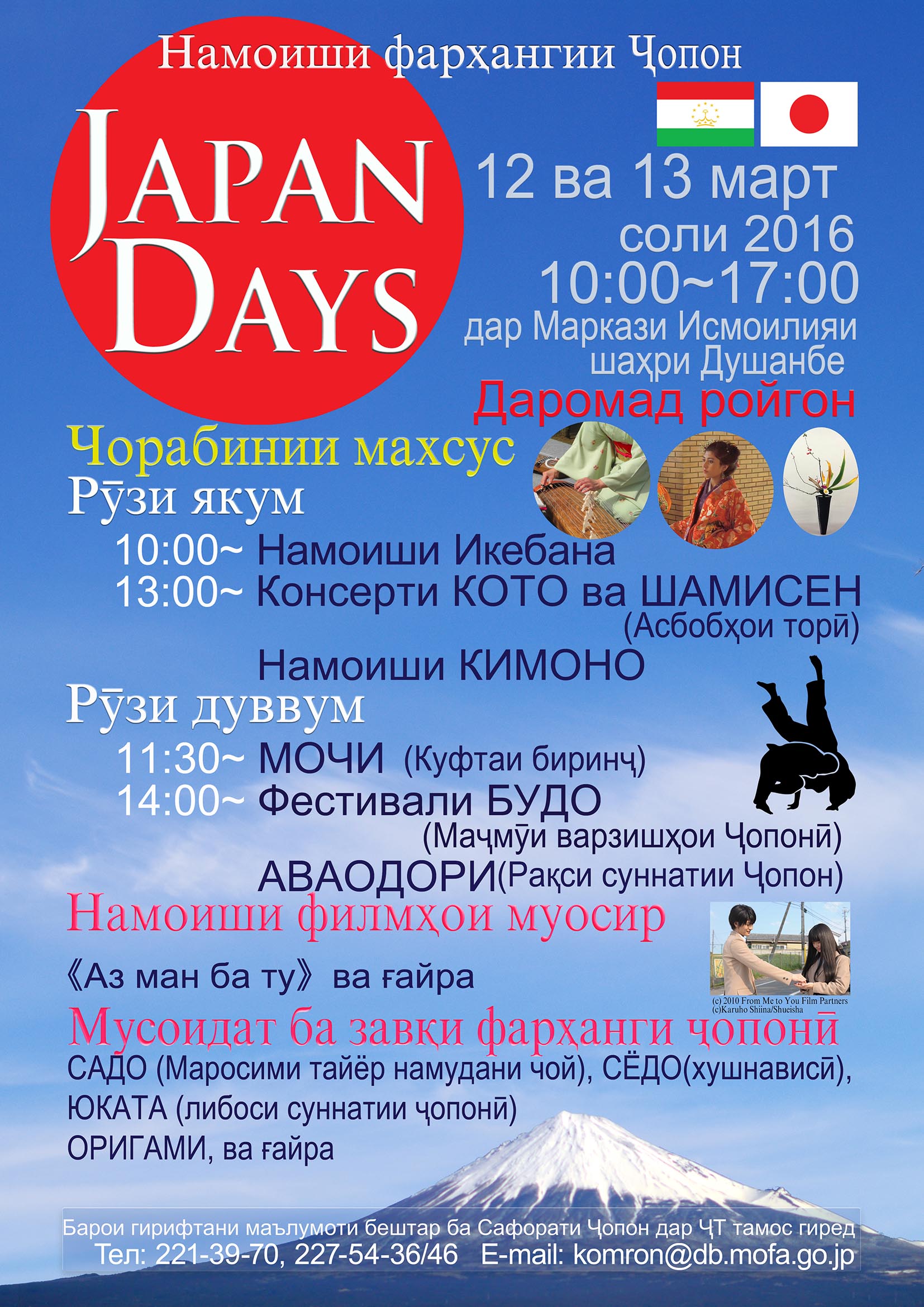 По инициативе Посольства Японии в Республике Таджикистан 12 и 13 марта 2016 года в Исмаилитском Центре в городе Душанбе пройдет Фестиваль культуры Японии «Дни Японии».