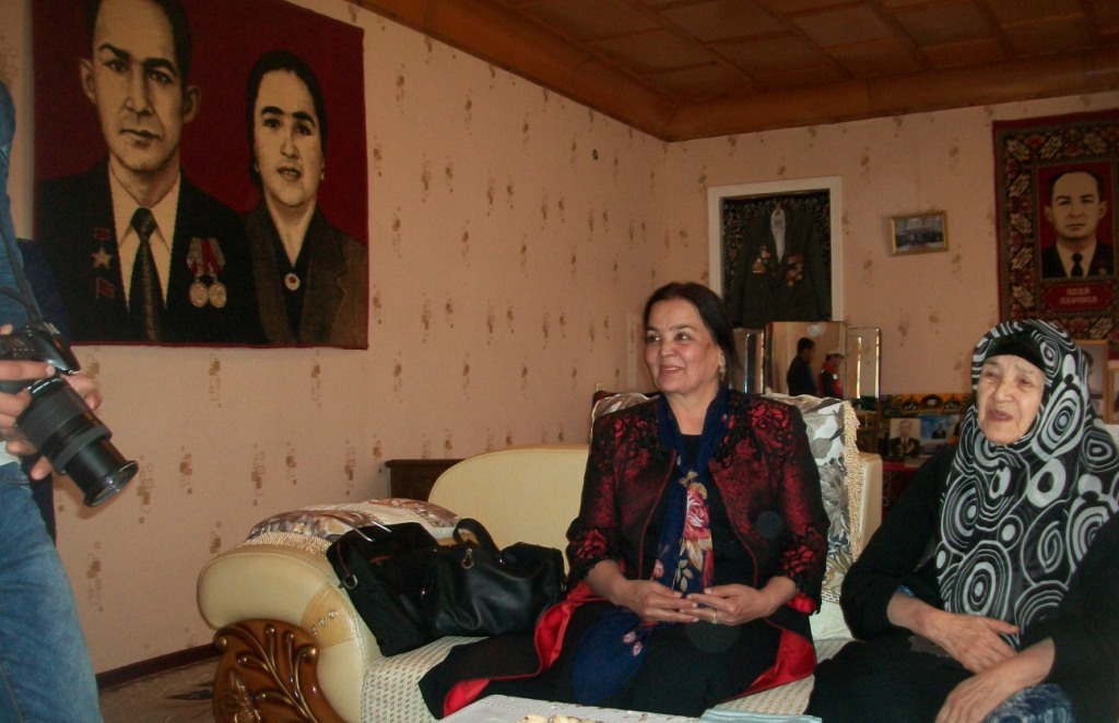 Следующей в списке посещений у нас была супруга Героя Советского Союза Ходи Кенджаева, которая проживает со своими детьми, внуками и правнуками в джамоате Хистеварз. Сотрудница ОКПТ Тоджиниссо Сиддикова прокомментировала цель визита: «Семья героя не относится к категории малоимущих, но наша организация и волонтеры постоянно навещают супругу Ходи Кенджаева, справляются о ее здоровье. Ведь наша  мирная жизнь и спокойствие стали возможными благодаря самоотверженности и подвигу этих наших отцов». Супруга героя, 87-летняя Хайриниссо Кенджаева встретила нас в просторной комнате-музее Героя Советского Союза Ходи Кенджаева. Поблагодарив за внимание и поздравления, она сказала: «Я жива памятью своего незабвенного супруга, радостью, которую мне приносят  мои внуки и правнуки. Нет ни дня, чтобы меня не навещали школьники, дети, молодежь, представители местной власти… Когда видишь и ощущаешь всеобщую любовь и заботу, начинаешь  понимать насколько значим подвиг наших близких и предков».