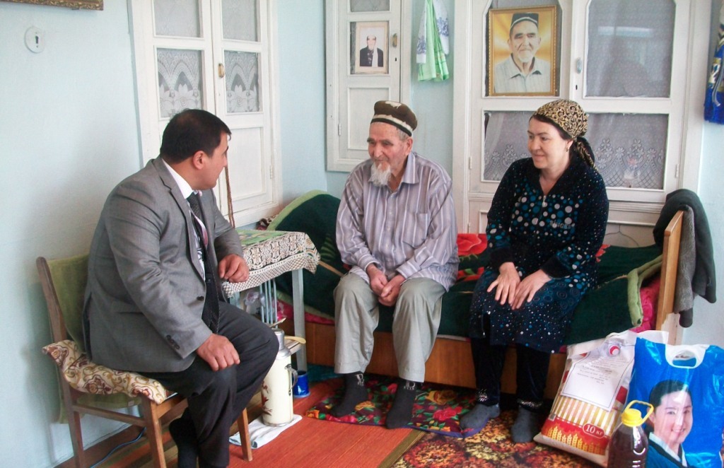 Мы вошли в скромный ухоженный дворик ветерана судебных органов и органов юстиции республики Муроджона Раджабова,  который многие годы был председателем Согдийского областного суда и возглавлял областной Совет юстиции. Сейчас он инвалид, прикован к постели и без посторонней помощи передвигаться не может. Руководство областного ОКПТ поинтересовалось его самочувствием и поздравив ветерана с Наврузом, отметило, что социальная политика Лидера нации, президента страны Эмомали Рахмона направлена на поддержку и постоянную заботу о ветеранах труда, пенсионерах, поддержку малоимущих семей. «Я благодарен главе государства и председателю области, благотворительным организациям за то, что нас не оставляют без внимания не только в праздники, но и в будние дни», — сказал Муроджон Раджабов. Ветеран, несмотря на инвалидность, полон оптимизма и узнав Курбонджон Мирзоеву, сделал ей комплимент: «Я помню вас, когда вы работали на различных должностях в партийных органах. Вы нисколько не изменились, все такая же обаятельная».