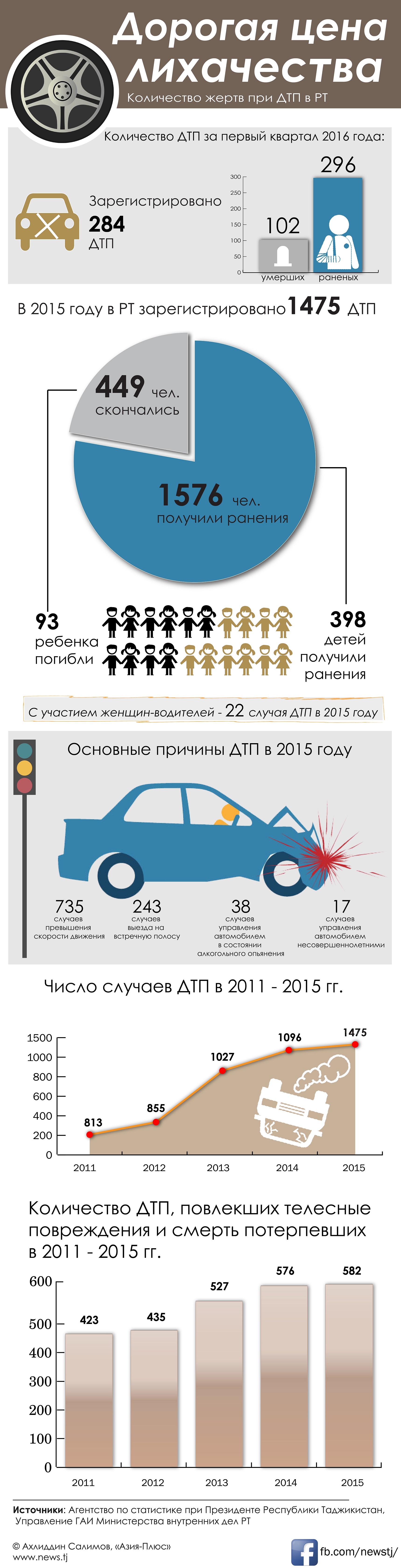 В 2015 году на дорогах Таджикистана погибли 449 человек. Страшные аварии унесли жизни 93 детей. Еще свыше полутора тысяч человек получили в результате ДТП различные ранения. Подробная статистика по ДТП в стране за последние пять лет в нашей инфографике.