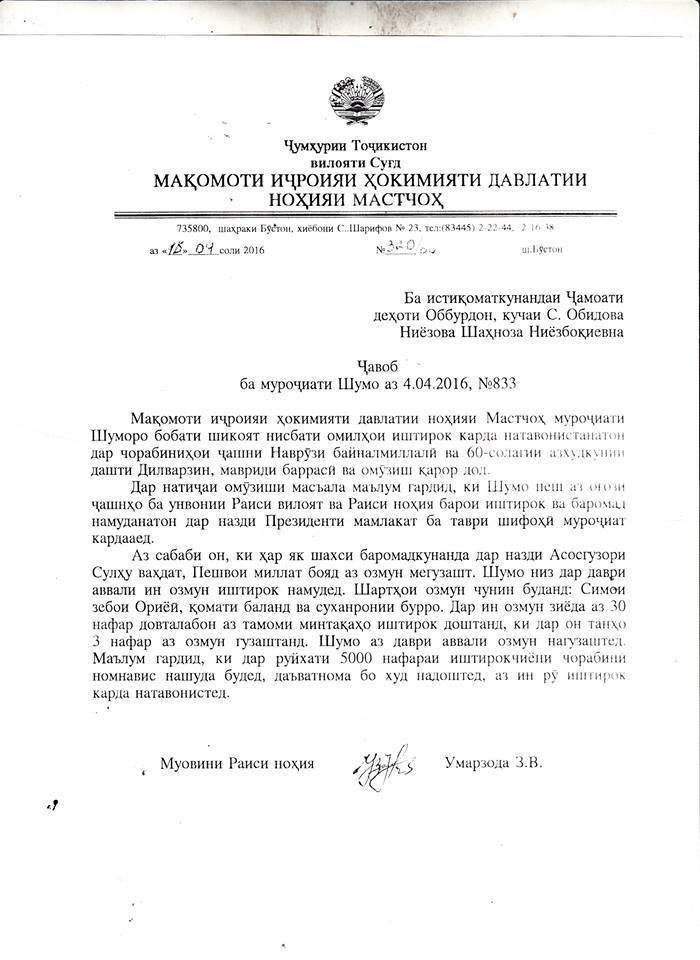 После этого Ш. Ниезбоки потребовала письменного ответа от администрации района. В ответе за подписью заместителя председателя района Умарзода В. В., сообщила девушка, говорилось, что «для выступления перед Джаноби Оли необходимо иметь арийскую внешность, высокий рост и звучную дикцию». «В конкурсе на выступление перед президентом участвовало свыше 30 претендентов и только троим удалось его пройти», — подчеркивалось в письме чиновника.