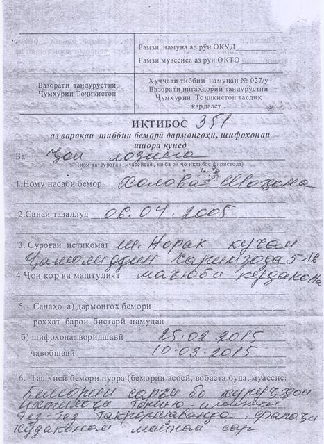 10 лет назад у нас родилась дочь Шохона с диагнозом – врожденная микроцефалия, тугоухость 2-й степени. А в два с половиной года у нее начались судороги. Все 10 лет нам необходимо было лечить и поддерживать нашу дочь дорогостоящими препаратами, а также ей были необходимы памперсы. Средств у нашей семьи на лечение дочери нет. Я работаю на Байпазинской ГЭС, но зарплаты не хватает, так как в семье я работаю один, а жена ухаживает за больной дочерью. Кроме Шохоны у нас еще трое несовершеннолетних детей. Из-за нехватки денег у нас накопились большие долги. Наша дочь совсем не спит, постоянно плачет из-за болей. Последние пять месяцев, с декабря 2014 года, у нее начала отказывать правая нога. На данный момент нога искривлена и почти совсем перестала двигаться.