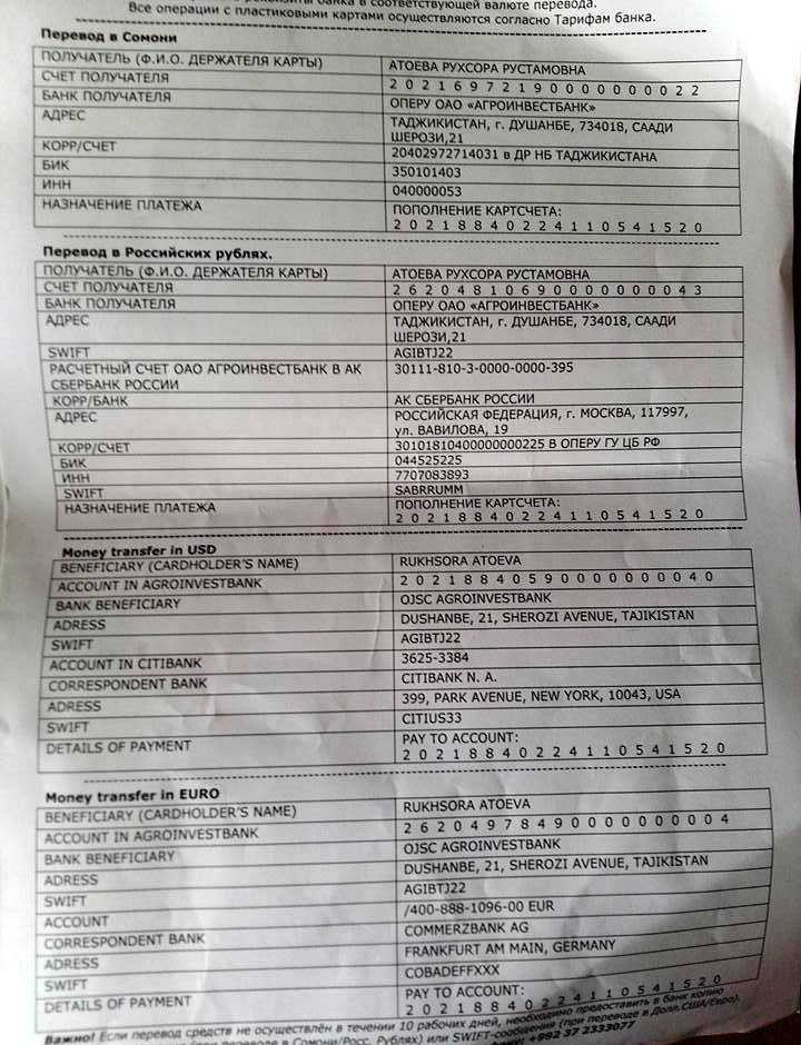 Телефон домашний +99237 2322772, телефон матери +992917441508, +992919581661 (сестра мужа Кумри).