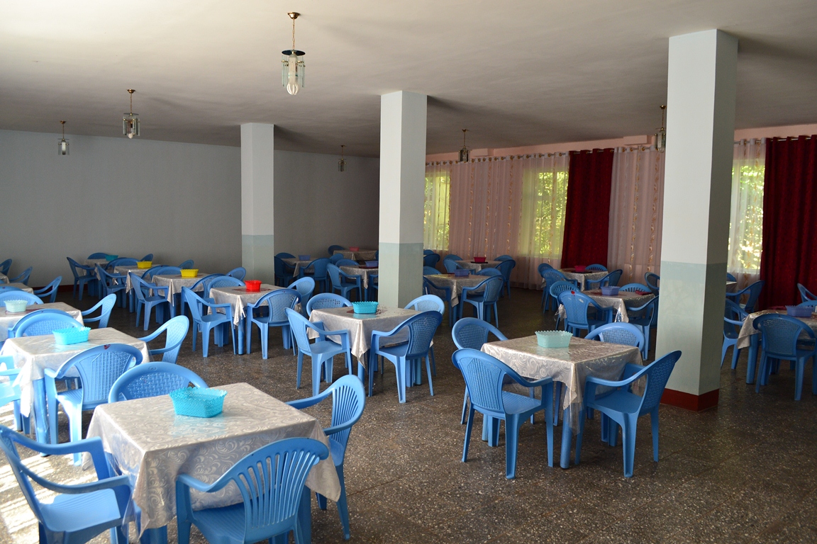 В столовой — пластиковые столы и стулья расставлены по всему залу среди свежевыкрашенных квадратных колонн. Пол чистый, но такой же обшарпанный, как и во всем санатории. В кухне убрано и чисто, но все предметы здесь — начиная от советских  столов и плит, заканчивая огромными алюминиевыми кастрюлями с потертыми боками — выглядят убого.
