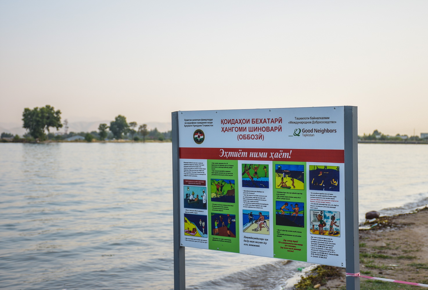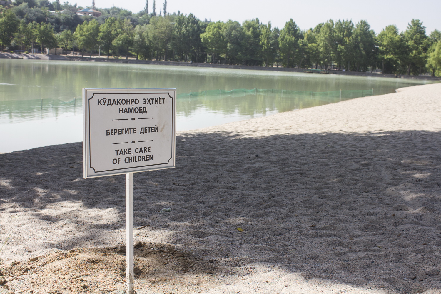 Молодежное озеро, больше известное, как Комсомольское – это отдельная история. Встречает нас предупредительной табличкой, написанной, наверное, не таджиками.