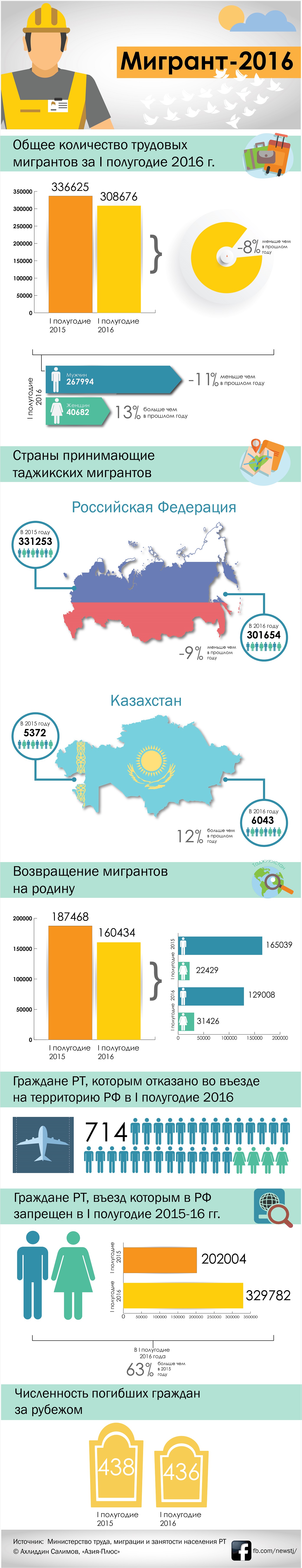Всего же по словам Сумангул Тагойзода, согласно учету о выезде и въезде граждан страны через государственную границу за первое полугодие 2016 года, из республики выехало 308 тыс. 676 трудовых мигрантов,  из них 267 тыс. 994 мужчины и 40 тыс.  682 женщины.