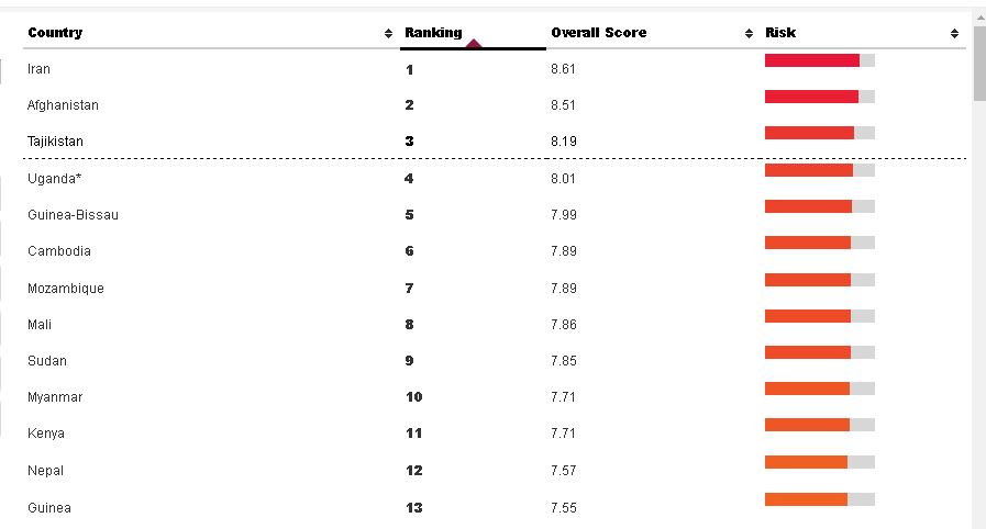 В десятку стран с самым высоким уровнем риска отмывания денег и финансирования терроризма вошли также такие страны, как Уганда, Гвинея-Биссау, Камбоджа, Мозамбик, Мали, Судан и Мьянма. В целом в рейтинге в этом году присутствуют 149 стран мира.