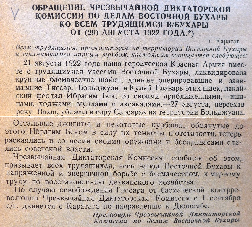 Одно из первых воззваний Чрезвычайной диктаторской комиссии к жителям Восточной Бухары.