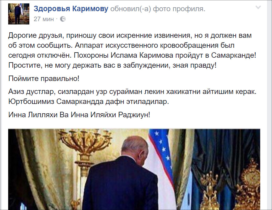 Как пишет ИА «Фергана», вчера около 20 часов по московскому времени в фейсбучной группе «Здоровья Каримову» появилась запись администратора группы о том, что «аппарат искусственного кровообращения был отключен сегодня».
