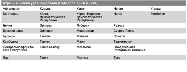 Таджикистан, наряду с наиболее отсталыми странами Африки, Афганистаном и КНДР, относится к странам с низким уровнем дохода. Валовый национальный доход (ВНД) на душу населения в этой группе стран составляет $1 045 и ниже, говорится в новом докладе Организации Объединенных Наций по промышленному развитию (ЮНИДО) со ссылкой на классификации стран и экономик по группам, разработанной Всемирным банком.