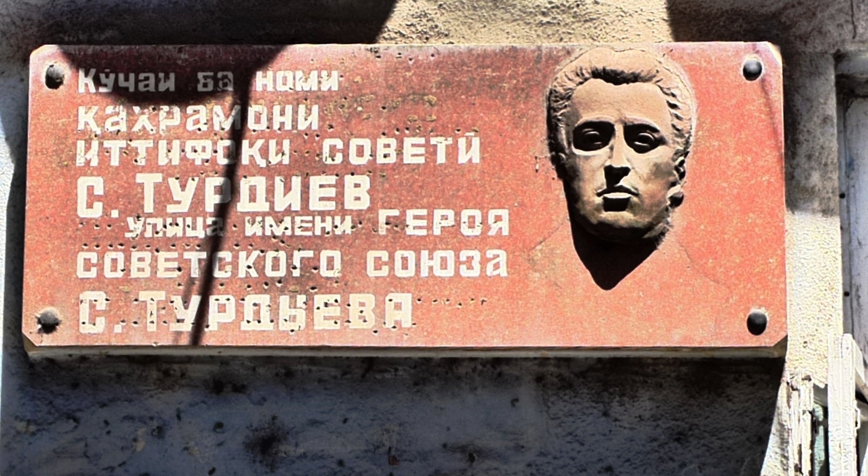 На фотографии видно, как сильно испорчена и повреждена мемориальная доска Герою Советского Союза лейтенанту Саидкулу Турдыеву, депутату Верховного Совета СССР 1-го созыва, установленная на одноименной улице в г. Душанбе.