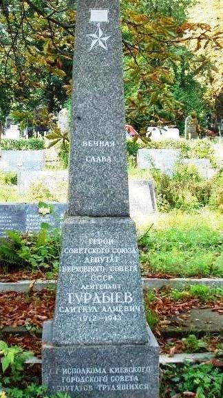 Обелиск на городском кладбище г. Киева в честь Героя Советского Союза лейтенанта Саидкула Турдыева. На фотографии видно, что киевляне берегут памятник и ухаживают за могилой таджикского героя.