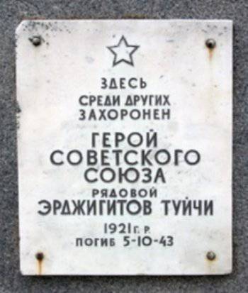 Мемориальная доска на месте захоронения Героя Советского Союза Туйчи Эрджигитова в городе Любань Тосненского района Ленинградской области. В городе Любань именем героя названа улица и установлен его бюст.