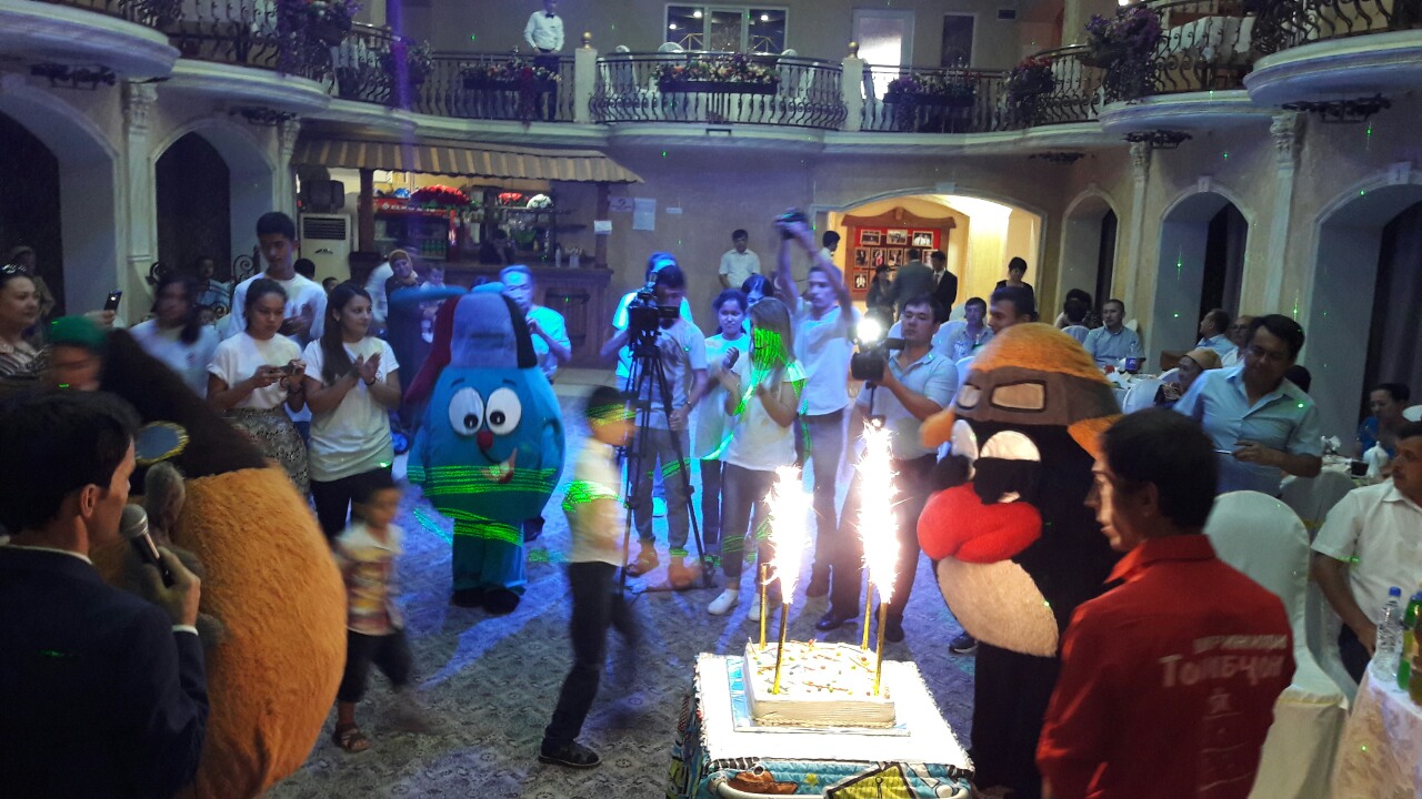 Шикарный и огромный зал ресторана, который, кстати, был бесплатно предоставлен руководством заведения для проведения этого благотворительного мероприятия, был празднично и по сказочному оформлен – украшен разноцветными шарами и цветами, игрушками, накрыты праздничные столы с разнообразными кушаньями, национальными яствами, сладостями, фруктами и напитками. В центре зала в ряд были выставлены свадебные подарки деткам – велосипеды и наборы подарок от имени компаний-спонсоров мероприятия. Разноцветные световые эффекты и прекрасная музыка придавали всему этому сказочную атмосферу. «Мы с утра здесь занимались оформлением зала, каждый из нас вложил душу, чтобы дети почувствовали себя в сказочном мире», — говорит волонтер организации Наргиза.